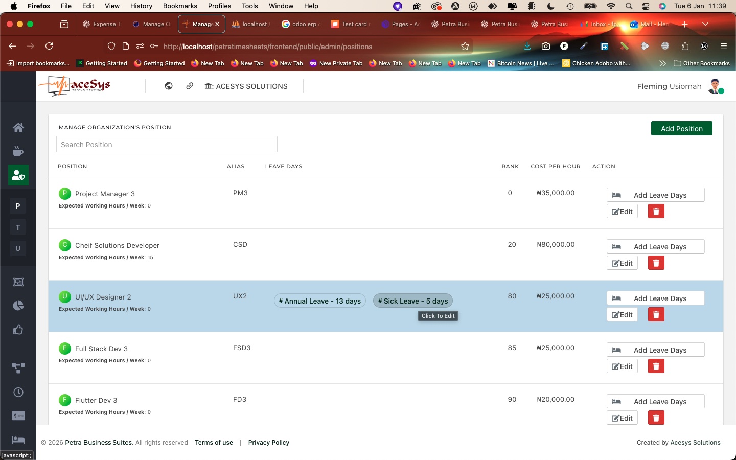 Once leave days are added, they appear as tags or badges directly on the position row (e.g., Annual Leave – 13 days, Sick Leave – 5 days).
