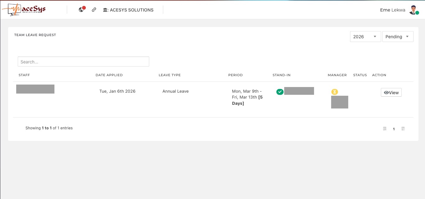 Managers can view all pending leave requests from the Leave Requests section. Each entry displays:
